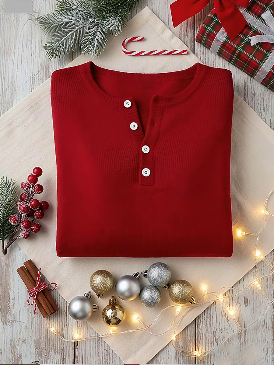Camille Douceur™ combina la suavidad del tejido con la elegancia de un diseño minimalista. Su cuello redondo con botones decorativos y su corte relajado crean una silueta favorecedora, perfecta para el invierno. Disponible en rojo profundo y rosa empolvado, transmite calidez y estilo con un aire sutilmente navideño.