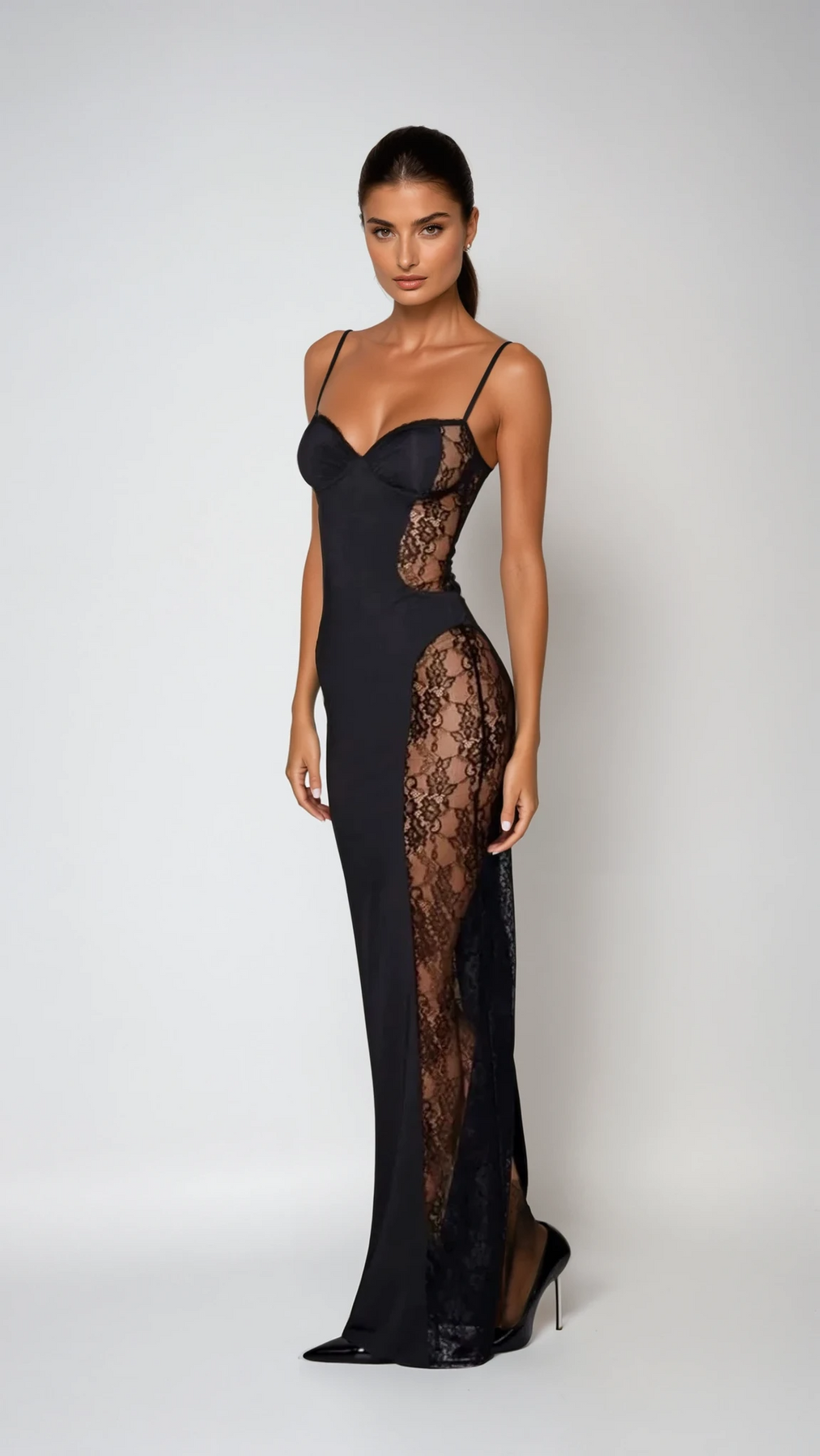 Descubre Catalina™, un maxi vestido entallado con encaje transparente que define la silueta con elegancia y sensualidad contemporánea. Diseñado para eventos nocturnos, galas y ocasiones especiales, transmite sofisticación, carácter y una feminidad segura de sí misma.