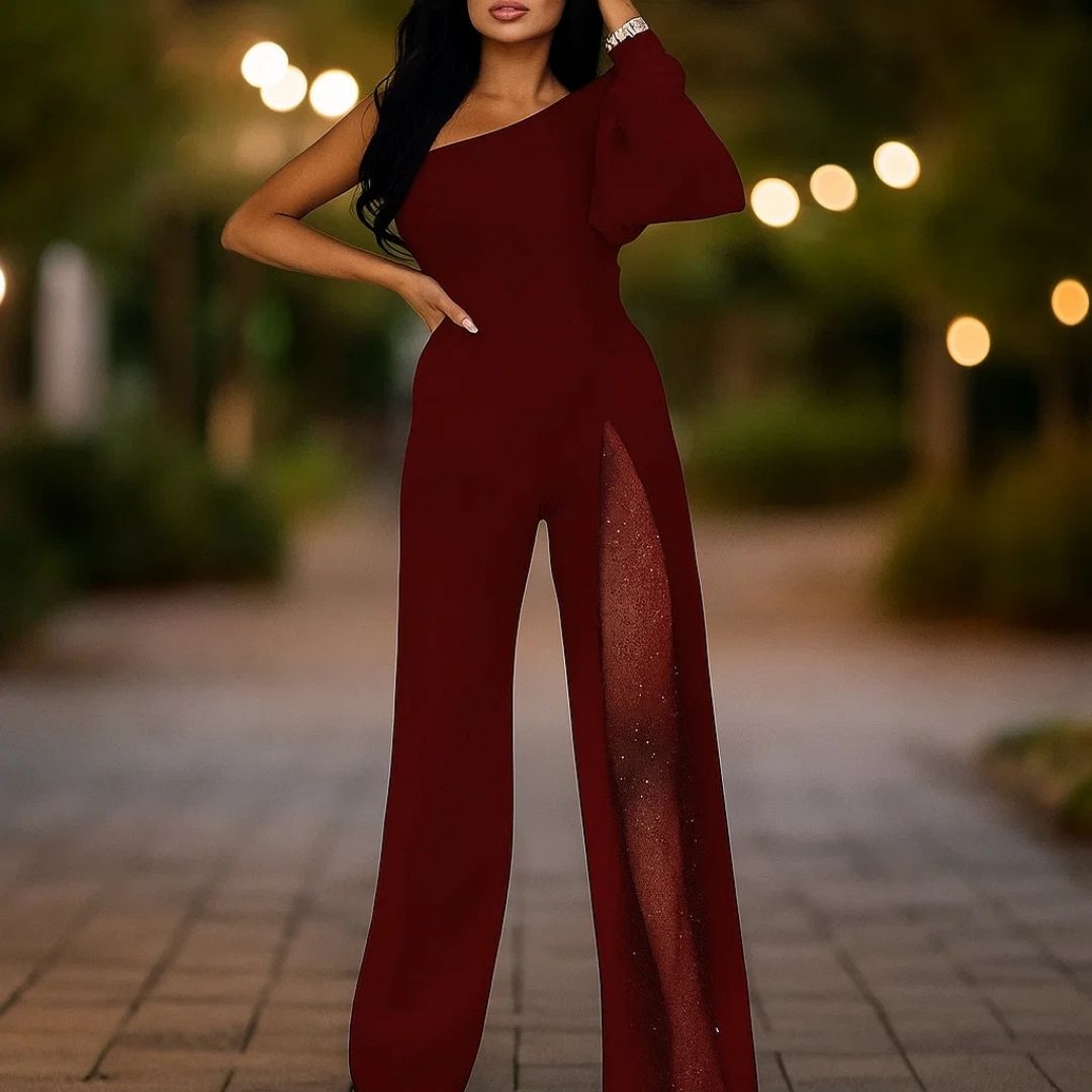 Medianoche™ es un mono negro de un solo hombro con pierna ancha y una abertura alta que revela un panel de malla con destellos: sexy y sofisticado a la vez. Fluido, cómodo y súper favorecedor; ideal para eventos, cenas y noches especiales.