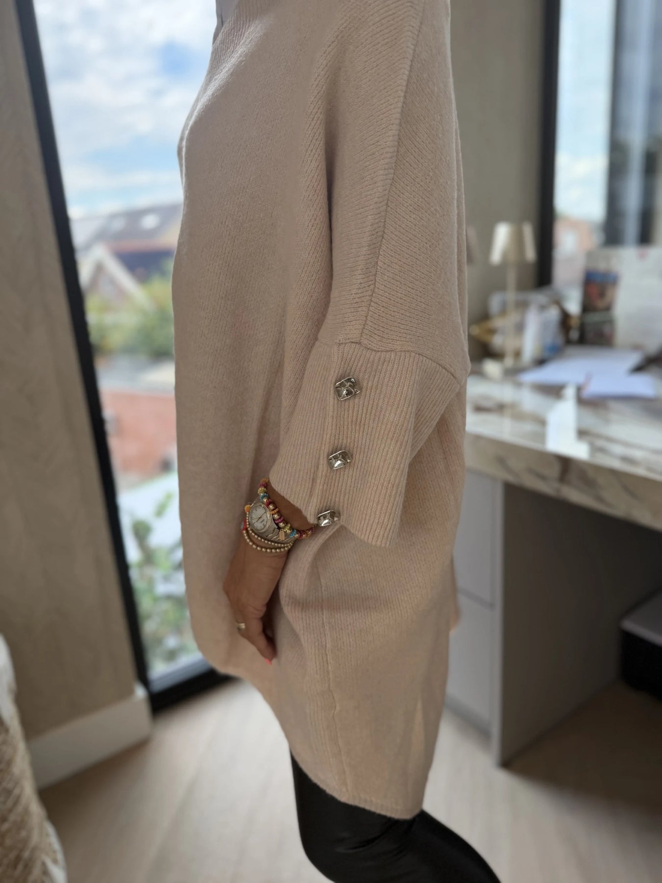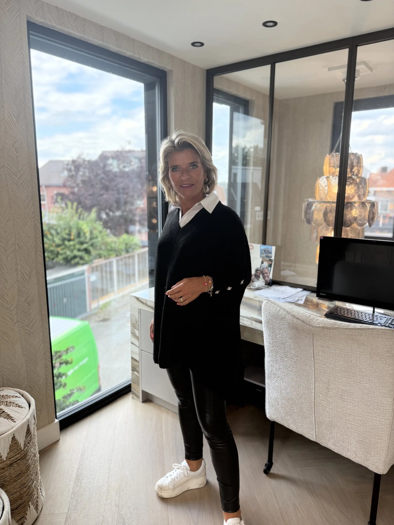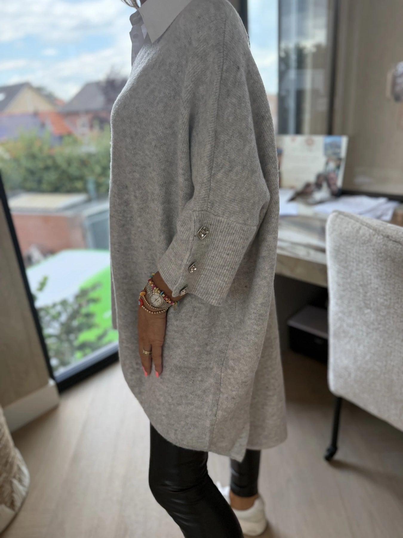 El suéter Clara™ es esa prenda única que transforma cualquier look. Su diseño con escote en V, botones decorativos y corte asimétrico aporta un aire moderno y chic, mientras que su tejido suave y ligero lo convierte en un básico irresistible para esta temporada.