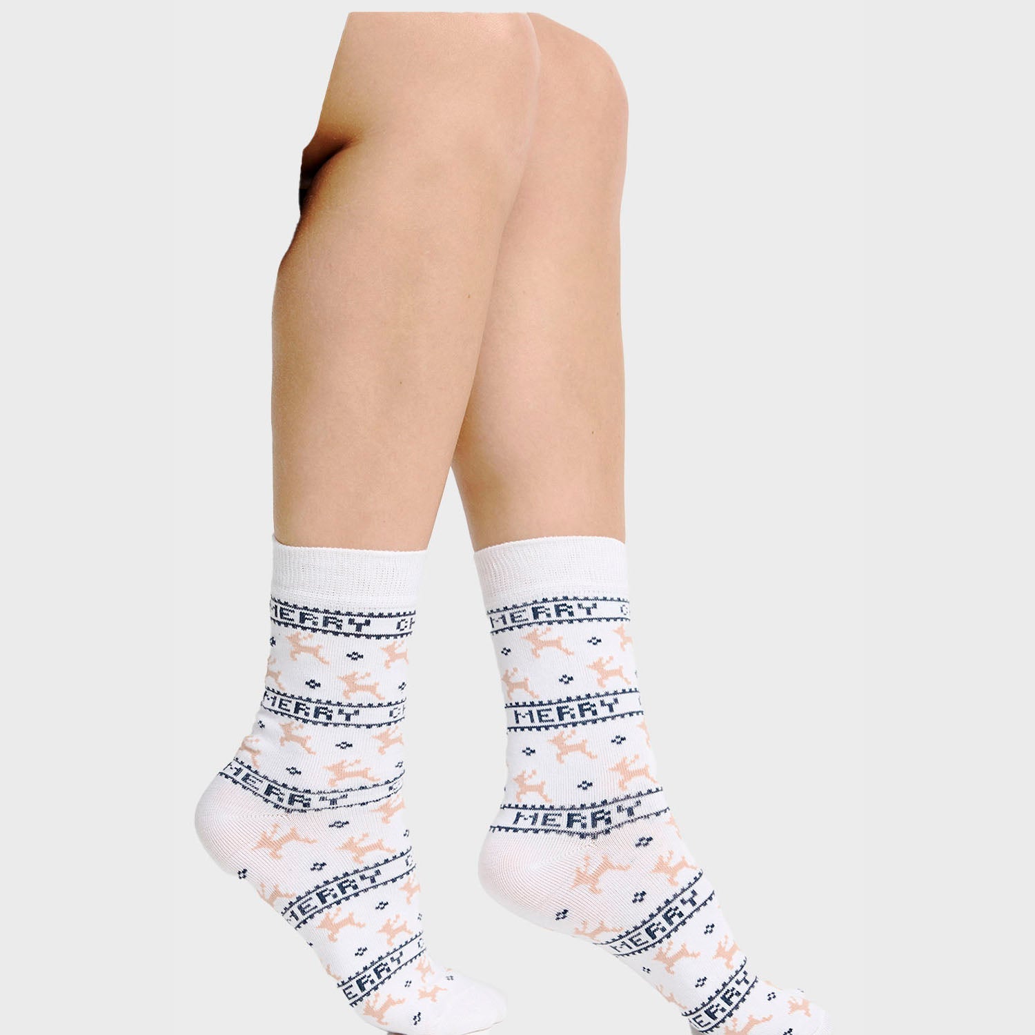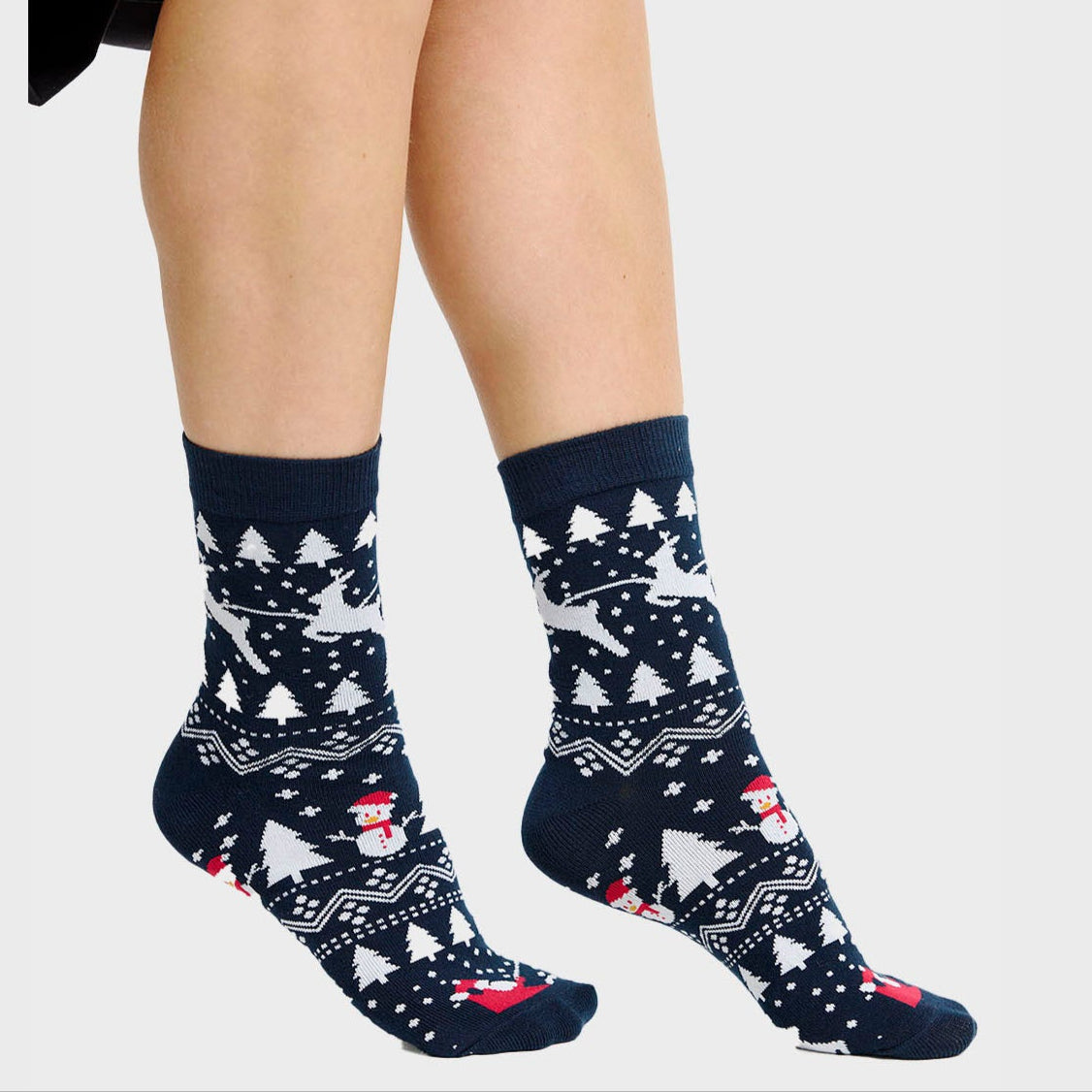 Descubre Aurora™, calcetines navideños de diseño invernal. Su tejido suave y ligero acompaña tus looks decembrinos con un toque acogedor y elegante. Perfectos para usarlos en casa, en reuniones familiares o para darle un guiño festivo a tu día; transmiten calidez, alegría y estilo sin exagerar.